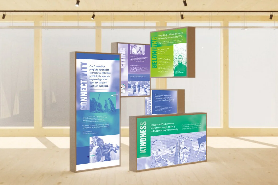 Our mission was to educate visitors on the progress and on-going work to improve safety, security and privacy behind the scenes; plus, remind everyone of all the undeniable good that comes from the communities built on the platform. We designed a sustainable chalet made of eco-friendly and recycled materials and created a look and feel that was human-centric and stat-driven so the proof was easy to take in, no matter where you looked.